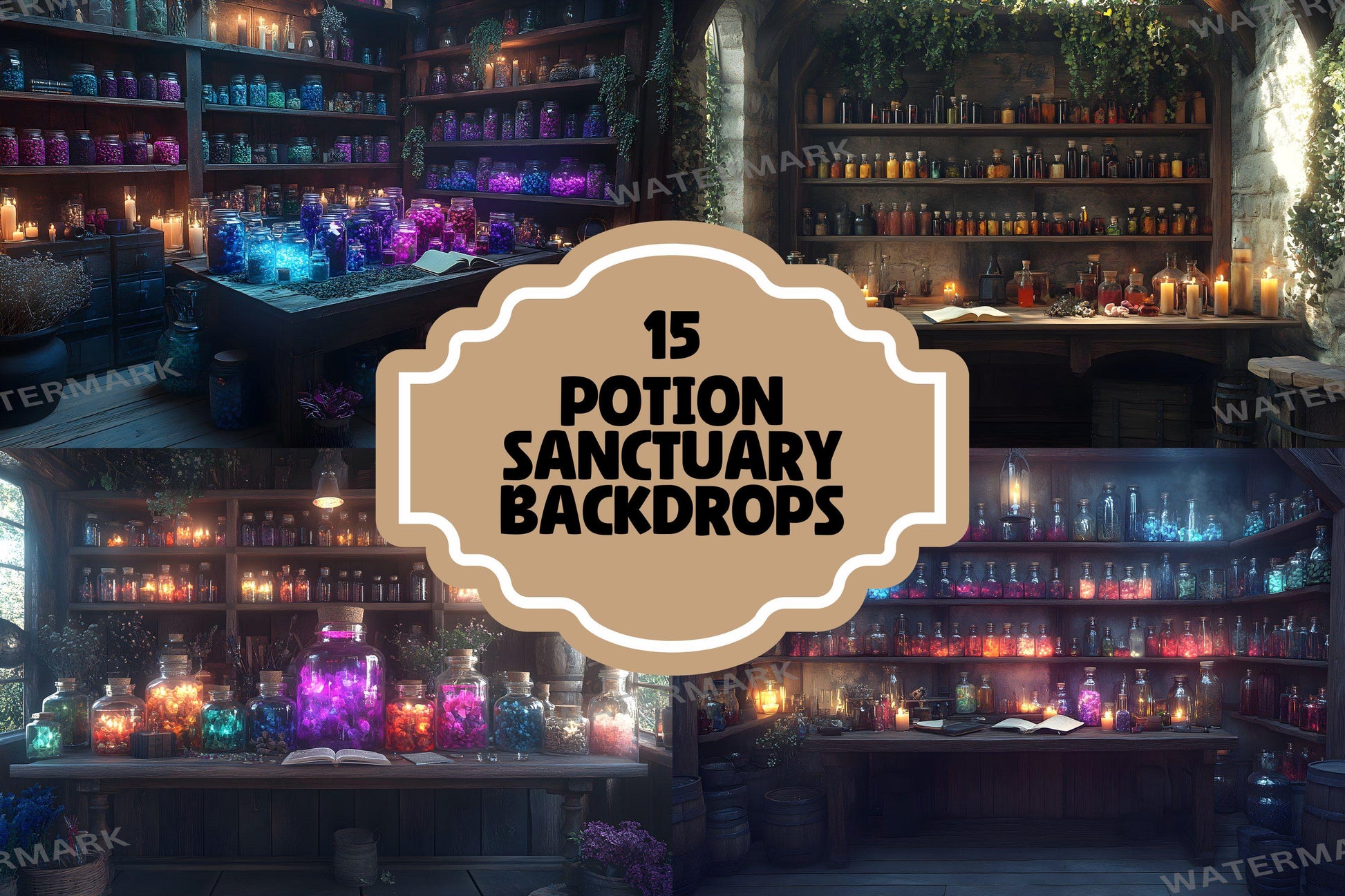 Step into a world of magic with 15 Potion Sanctuary backdrops! These high-quality digital backgrounds feature glowing potion bottles, mystical apothecary shelves, and enchanting candlelit labs. Perfect for fantasy lovers, witches, and creative projects.