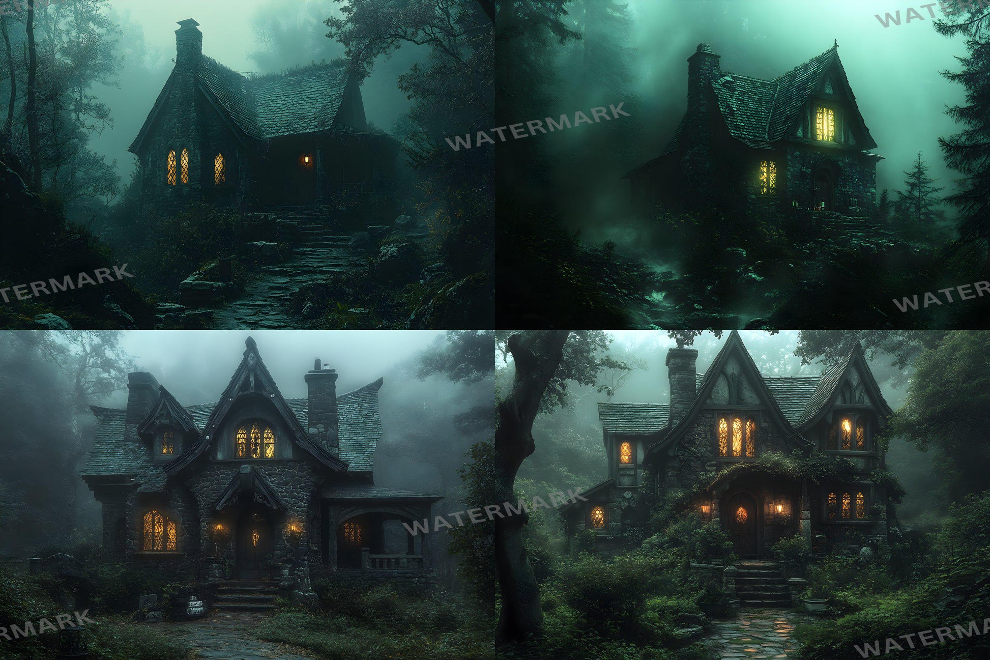 A collection of 20 witch���������s cottage retreat backdrops featuring cozy forest cabins, glowing lanterns, and mystical atmospheres. Perfect for digital artists, fantasy creators, and photographers looking for enchanted woodland settings with a magical touch.