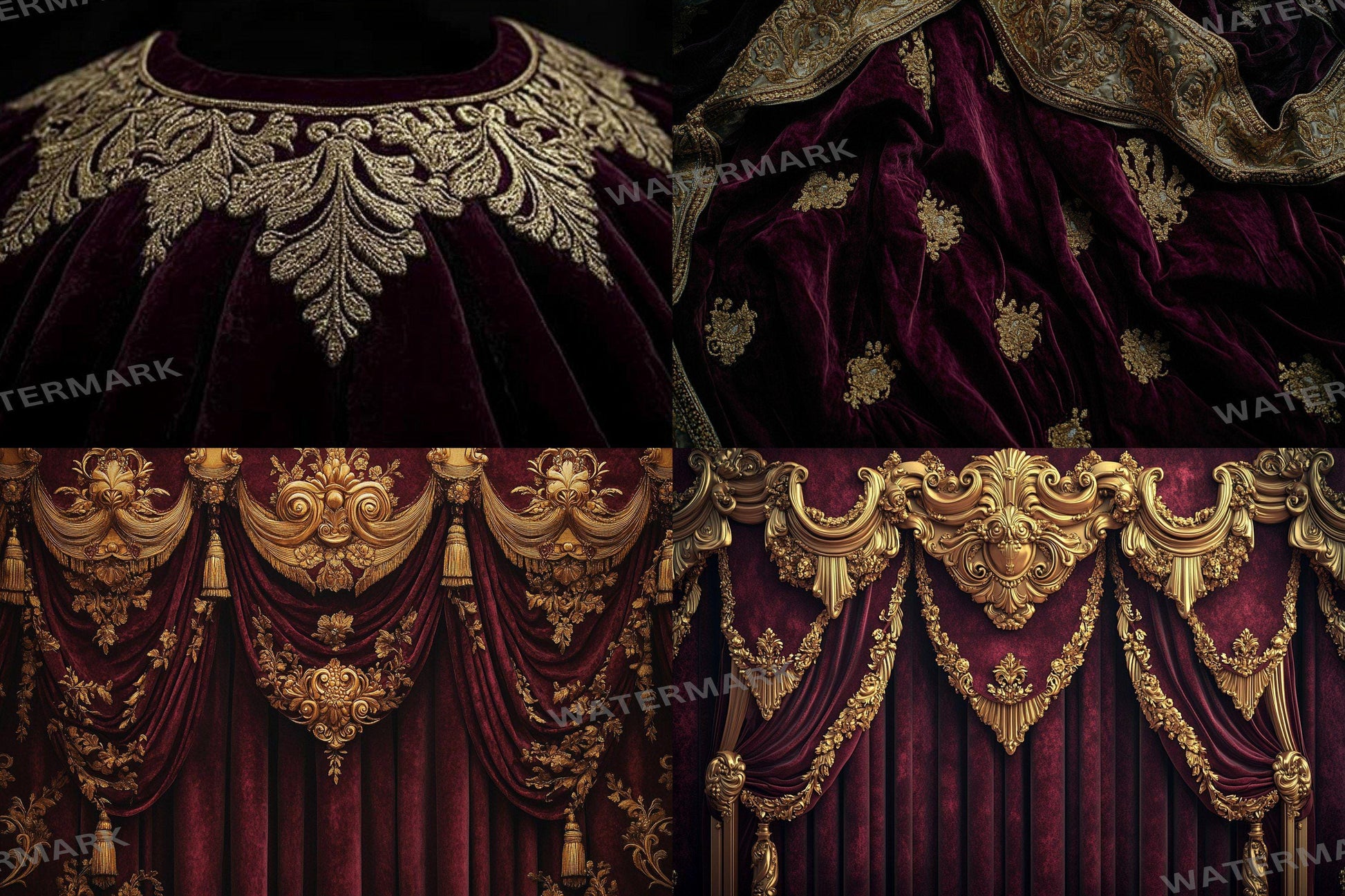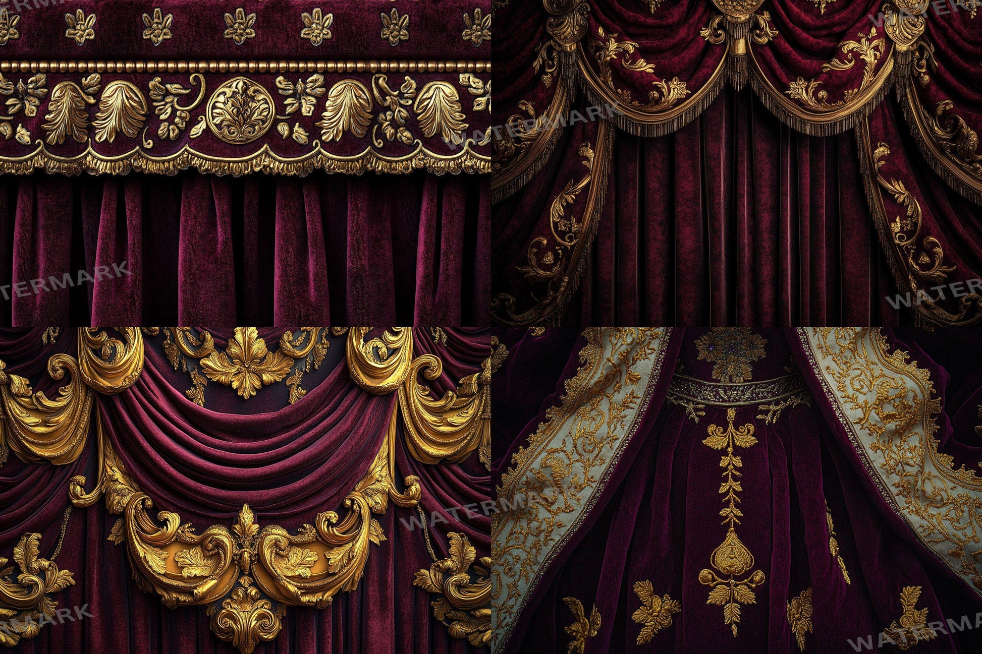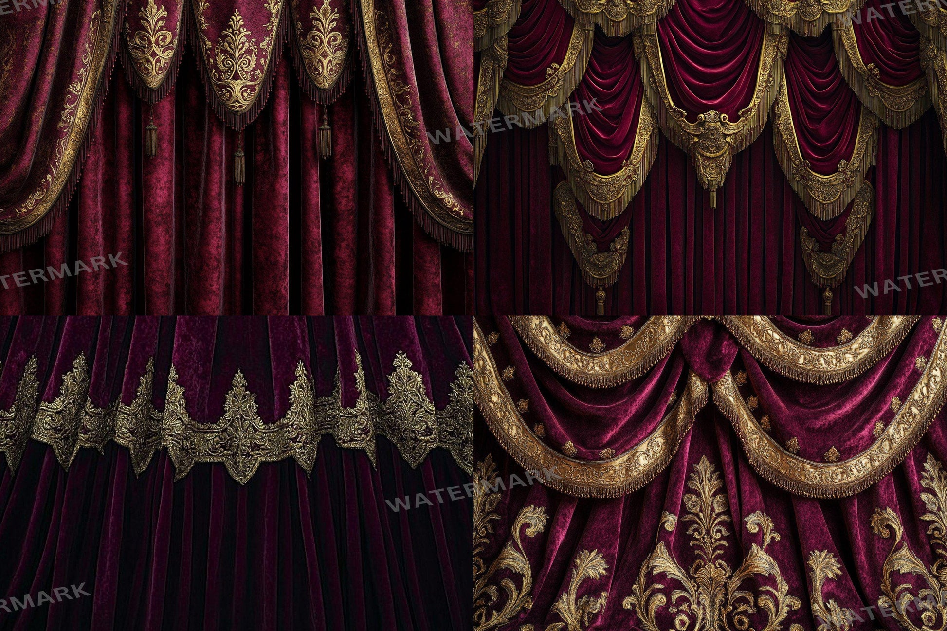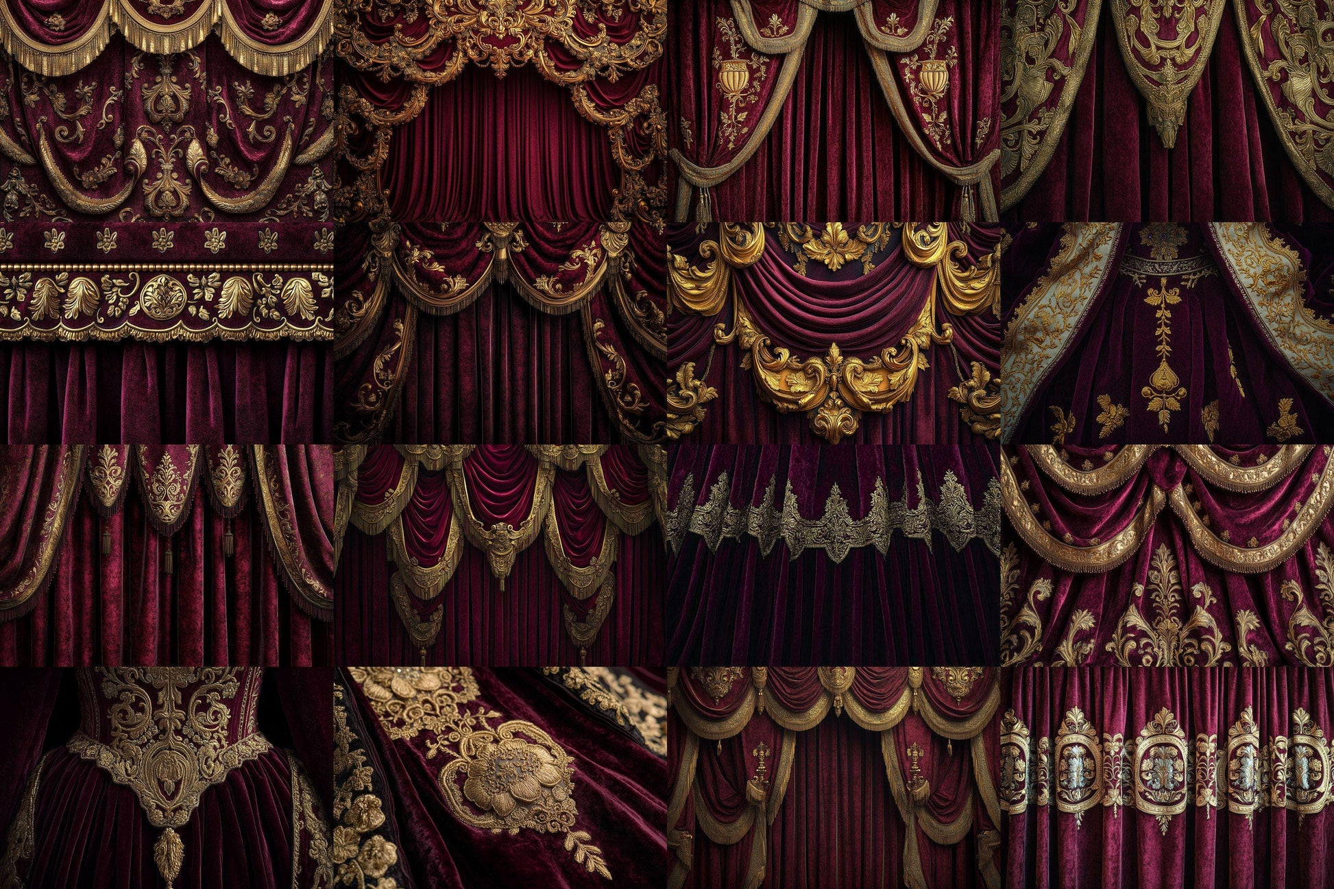Drape your projects in lavish elegance with our "30 Opulent Gold Drapes Backdrops"! This exquisite digital collection offers a variety of high-resolution backgrounds featuring rich, deep red velvet curtains adorned with intricate, shimmering gold embroidery and ornate detailing. Each backdrop is designed to evoke a sense of grandeur, luxury, and dramatic sophistication, perfect for creating truly captivating visuals.