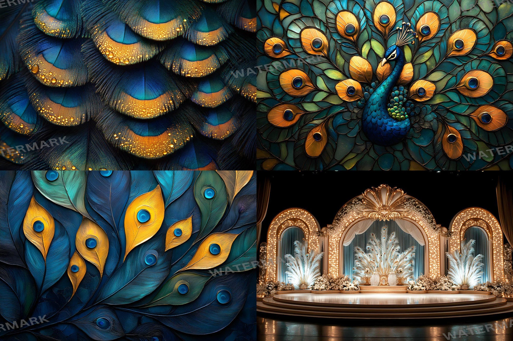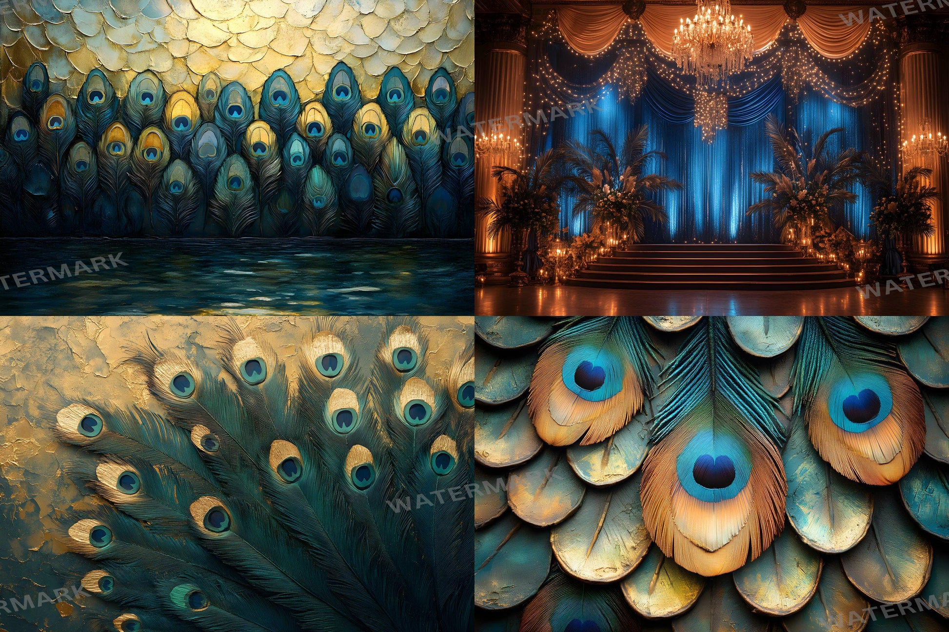 Transform your creative projects with these 45 stunning Peacock Deco Stage Backdrops. Perfect for theater productions, digital art, photography, event design, and fantasy aesthetics, these luxurious gold and teal backgrounds capture the elegance of peacock feathers in an art deco style.