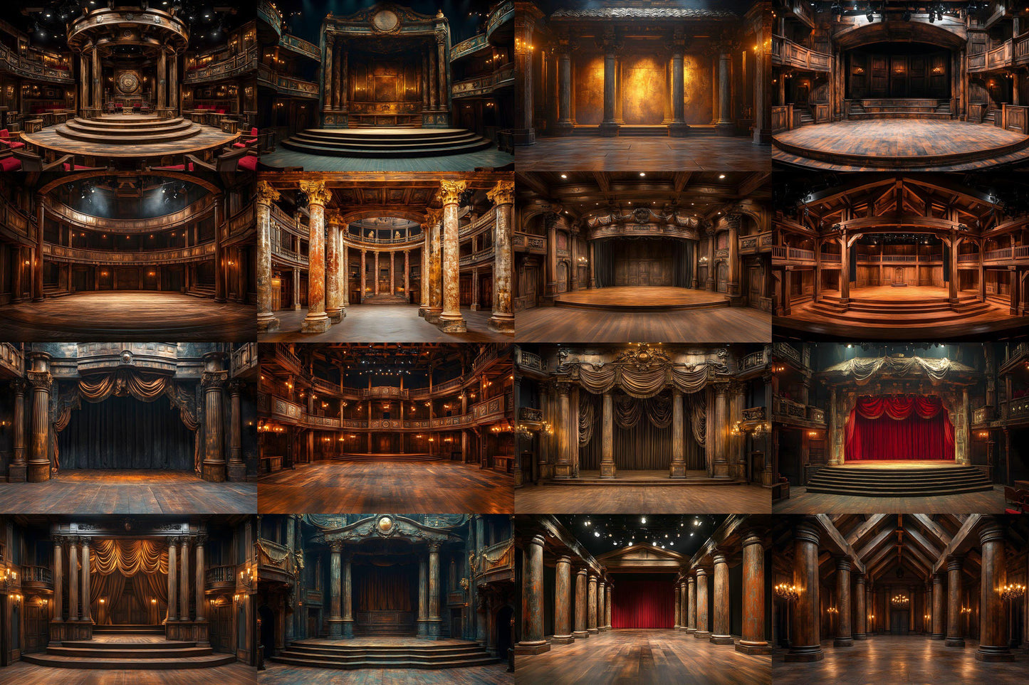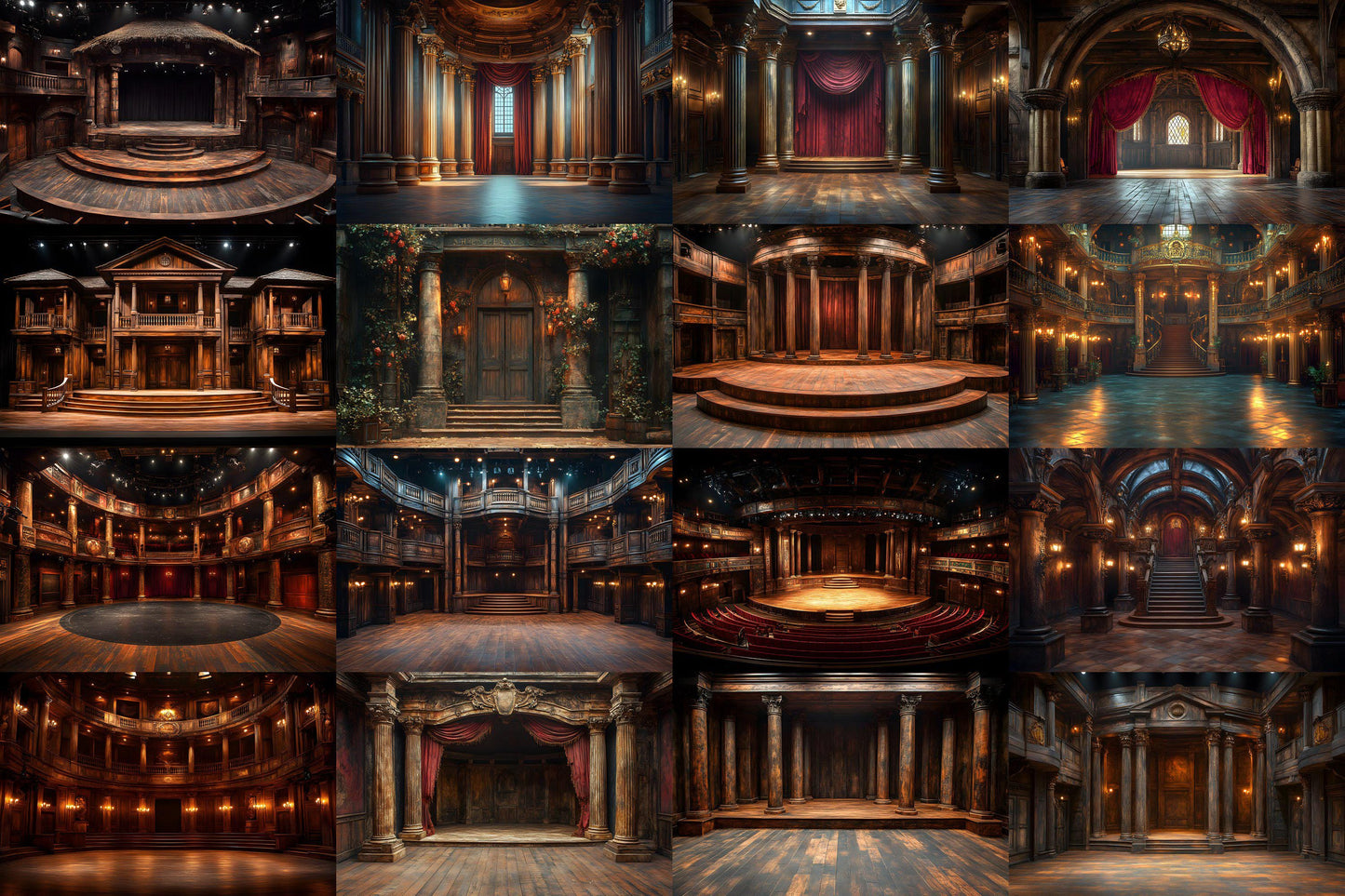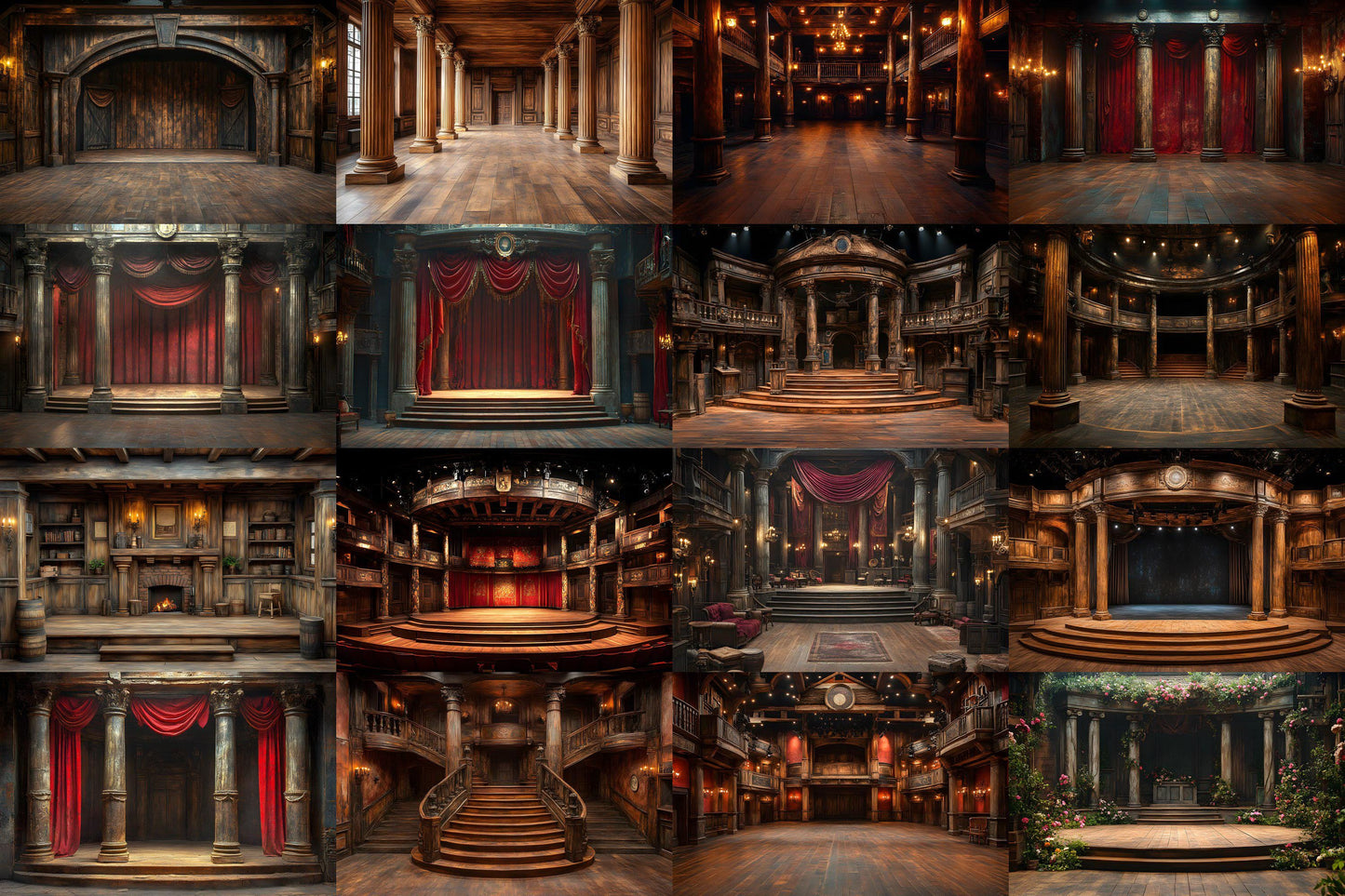 Shakespearean Stage Backdrops - Vintage Theatrical, Dramatic Play Scene, Regal Digital Backgrounds