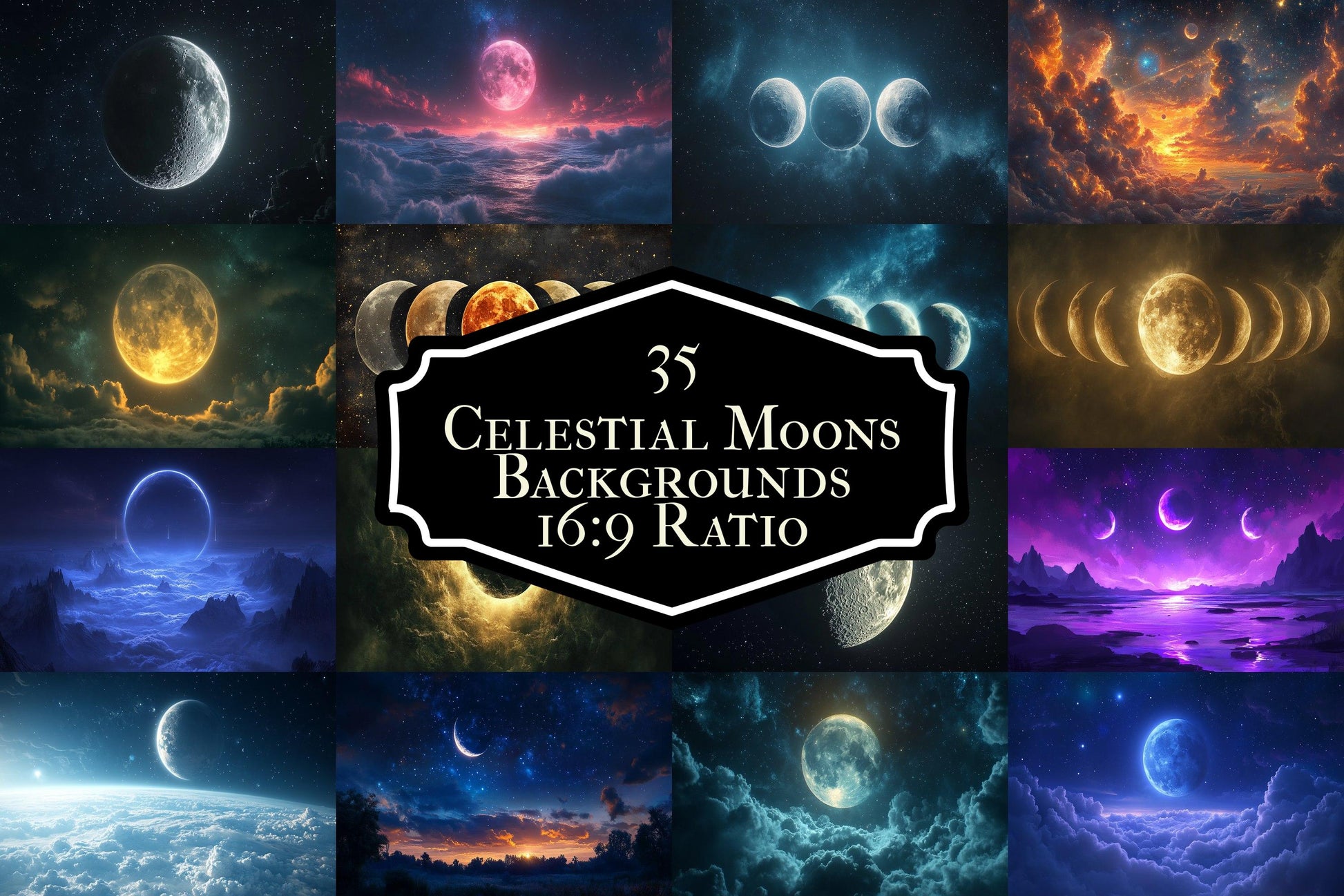 Celestial Moons Digital Backdrop ��������� A dreamy 16:9 scene with beautiful moons glowing in a starry sky. Perfect for TV wallpapers, streaming backgrounds, or photography backdrops, this serene celestial backdrop adds a magical and otherworldly atmosphere to any project.