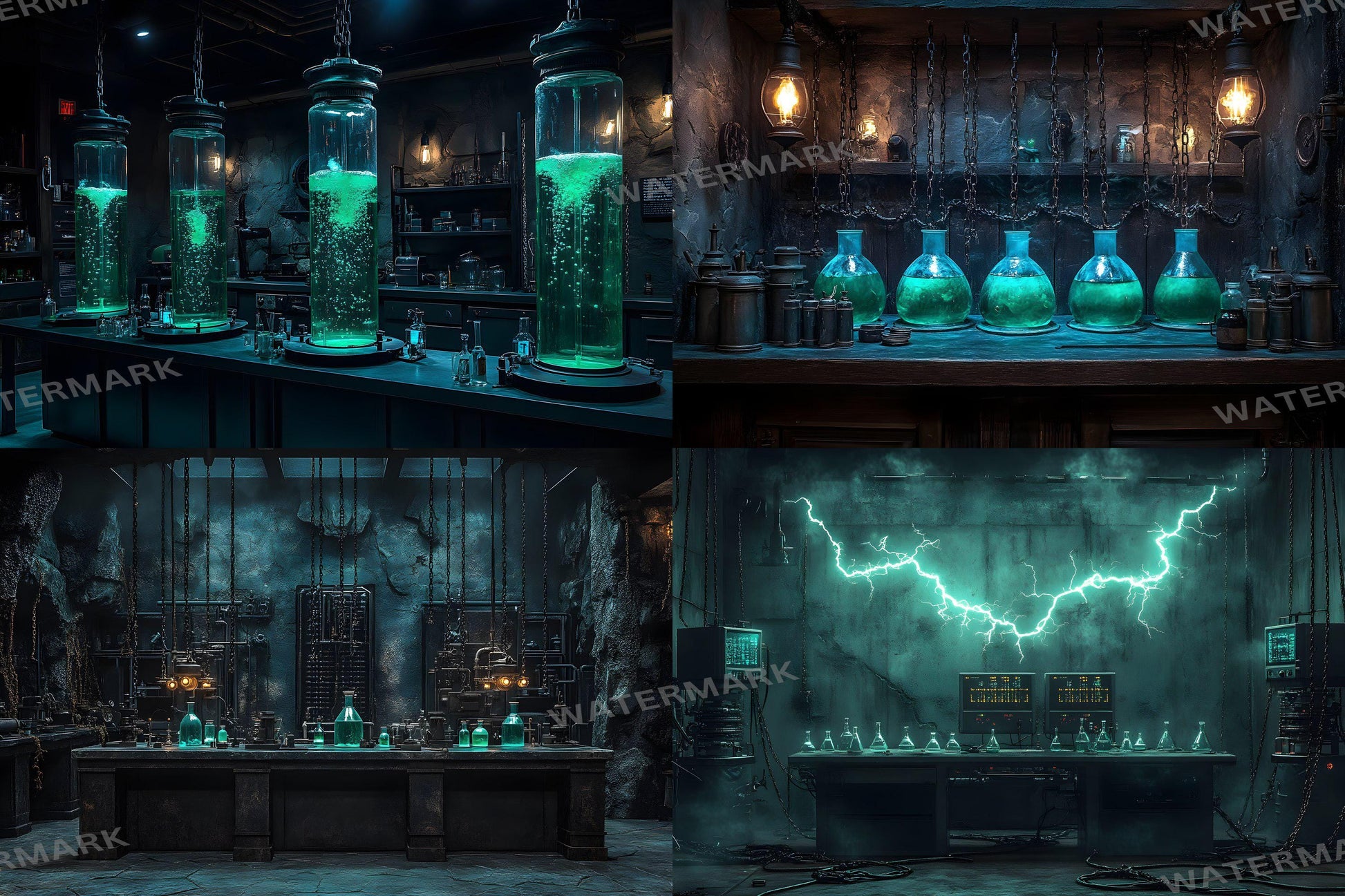 This mad scientist lab backdrop is perfect for spooky events, Halloween parties, gothic decor, or sci-fi photoshoots. Featuring eerie green potions, dark lighting, and a haunting atmosphere.