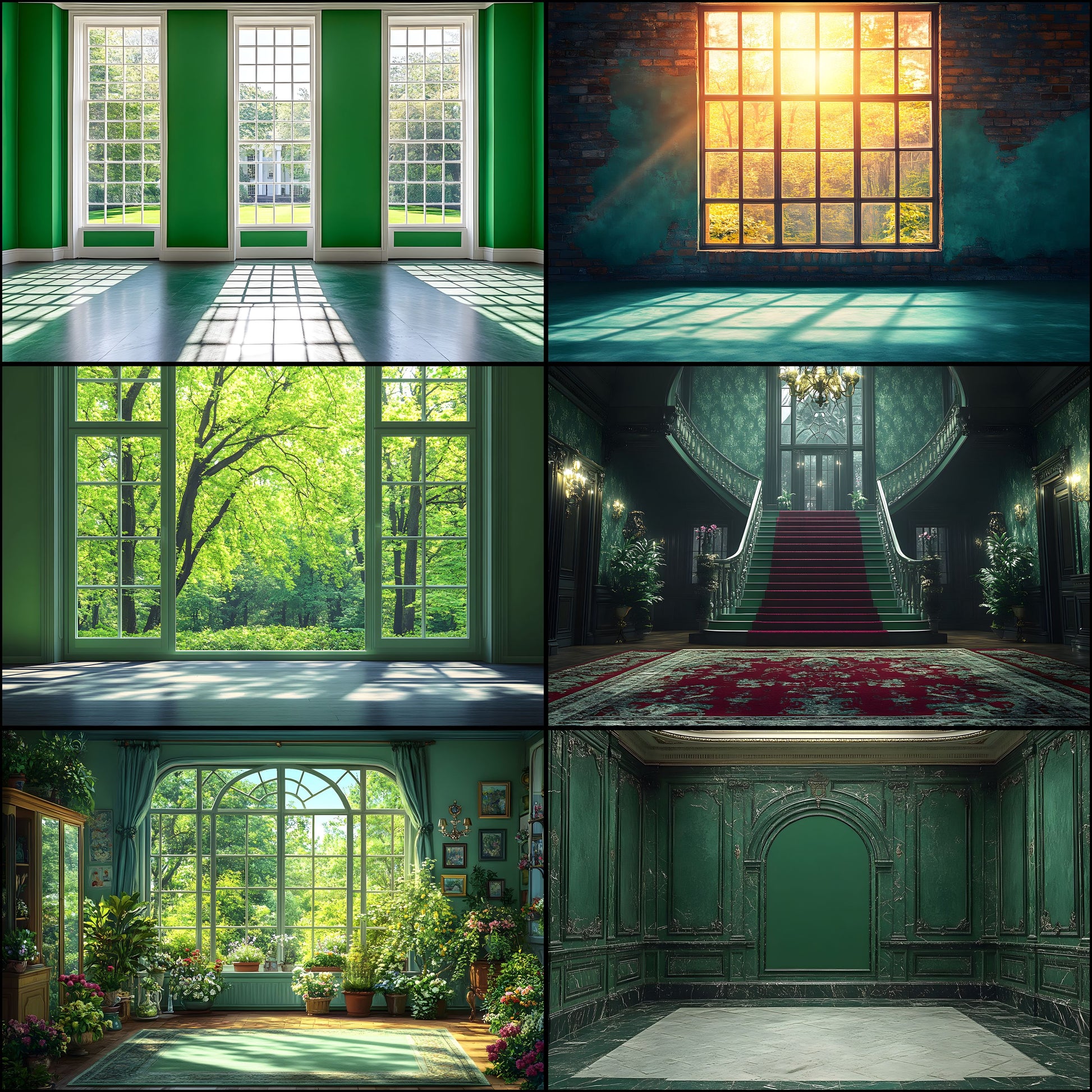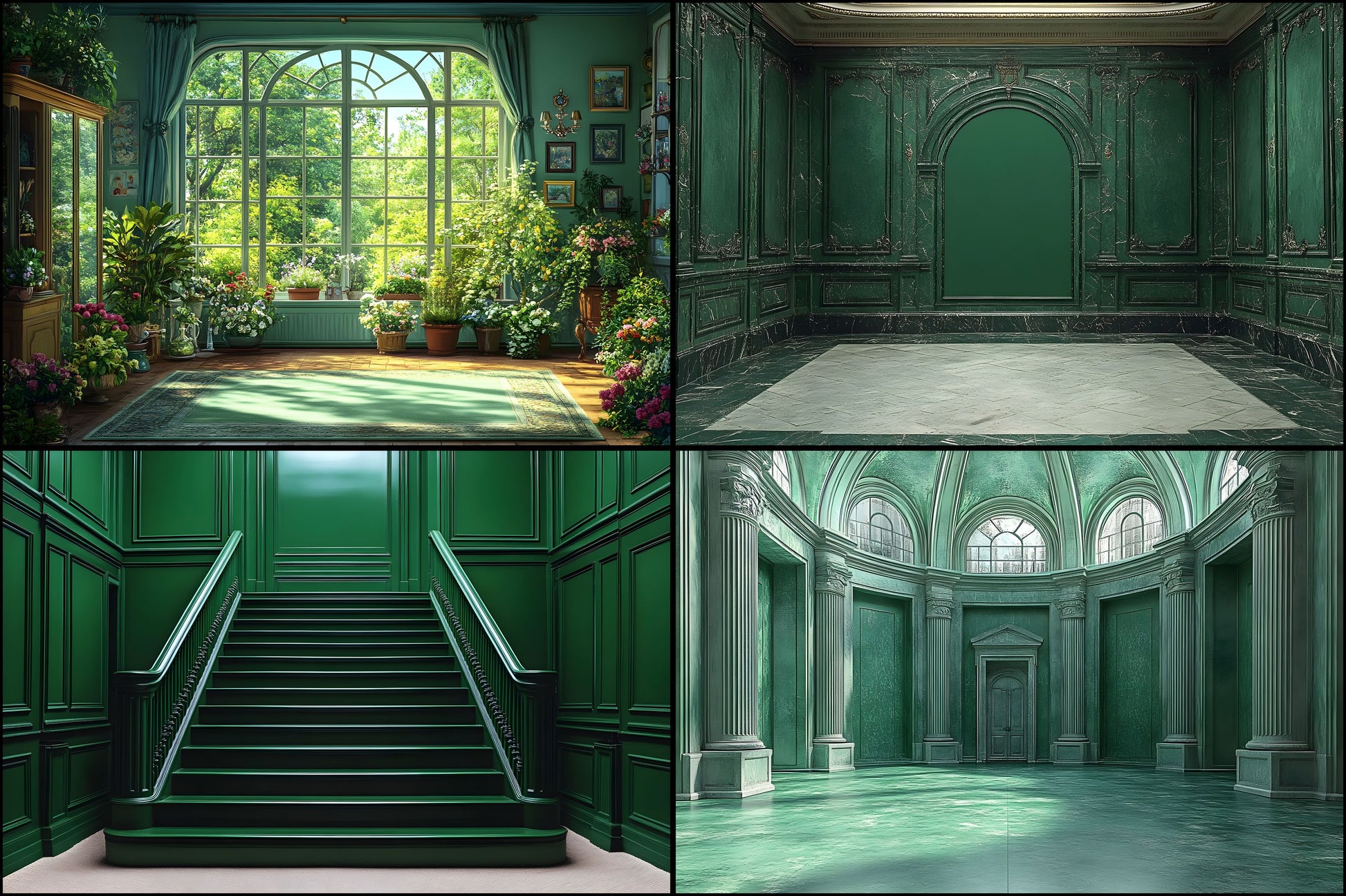 Royal Green Interior Digital Backdrop Collection, Photography Backgrounds, Elegant Home Photo Overlays, High-Resolution Images for Composites