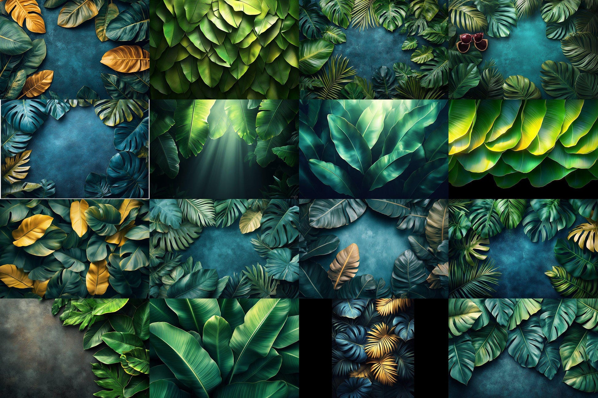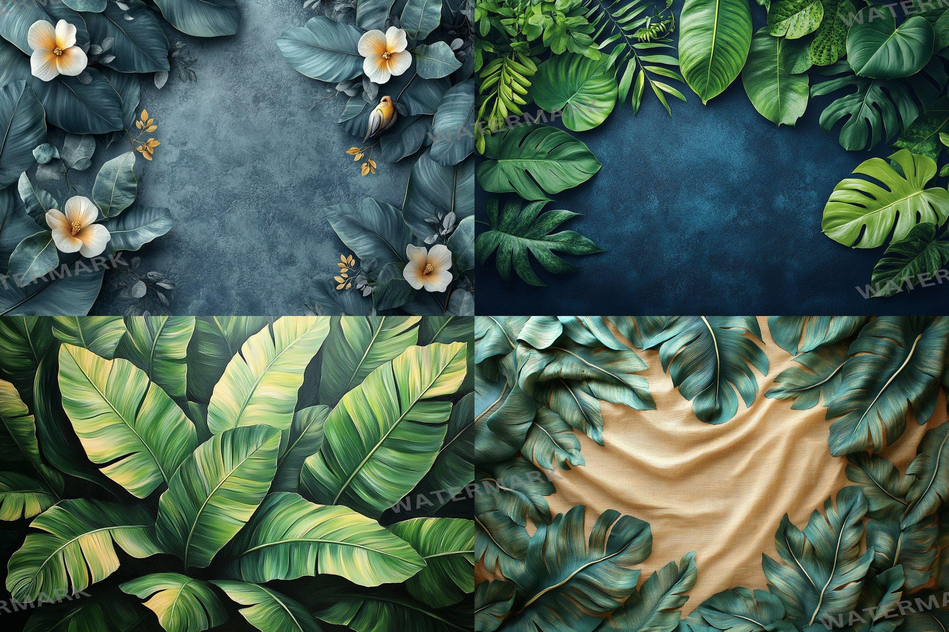 Tropical banana leaves digital backdrops, jungle PNG overlays for photography, botanical background scenes, lush greenery composites