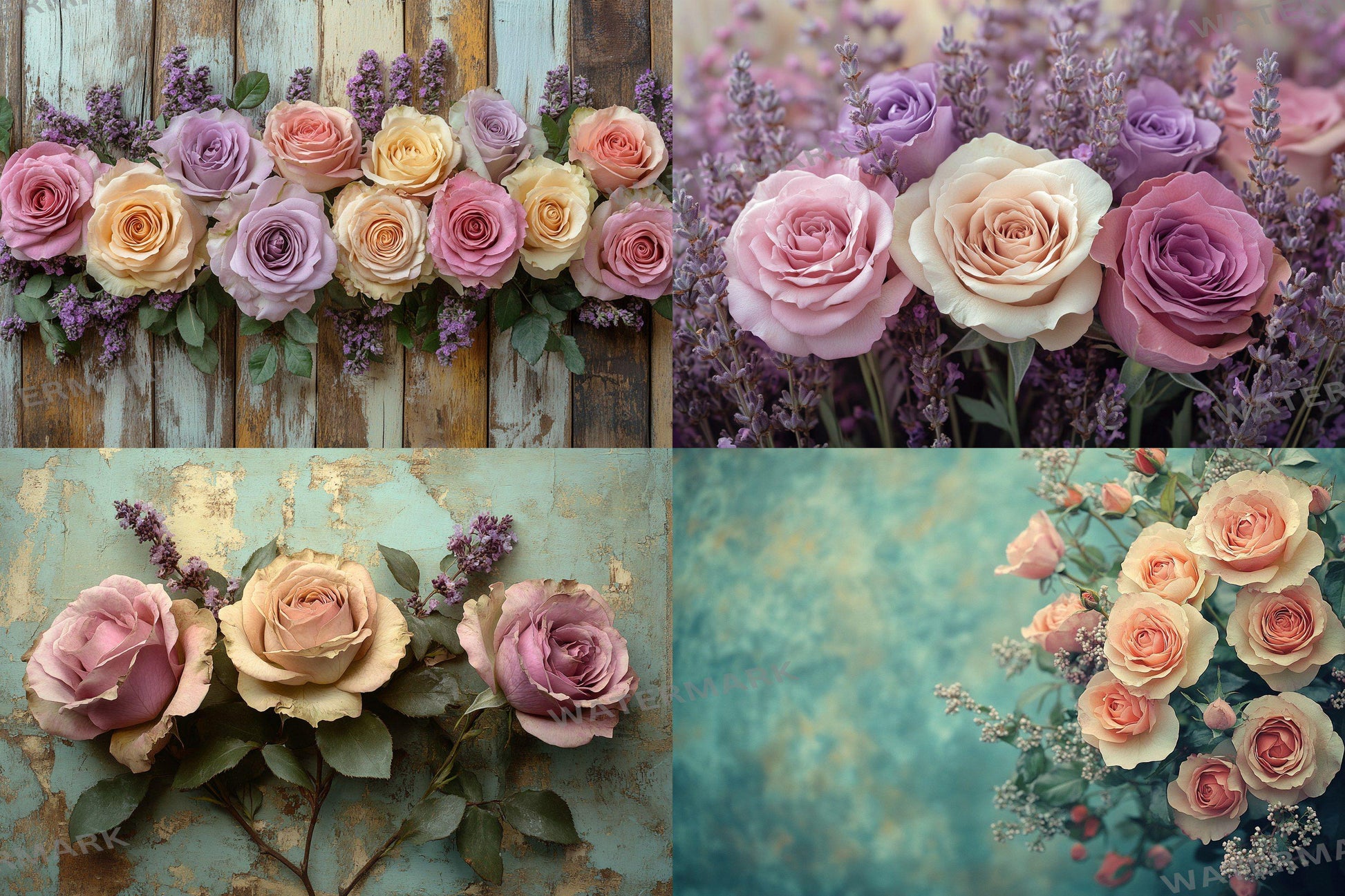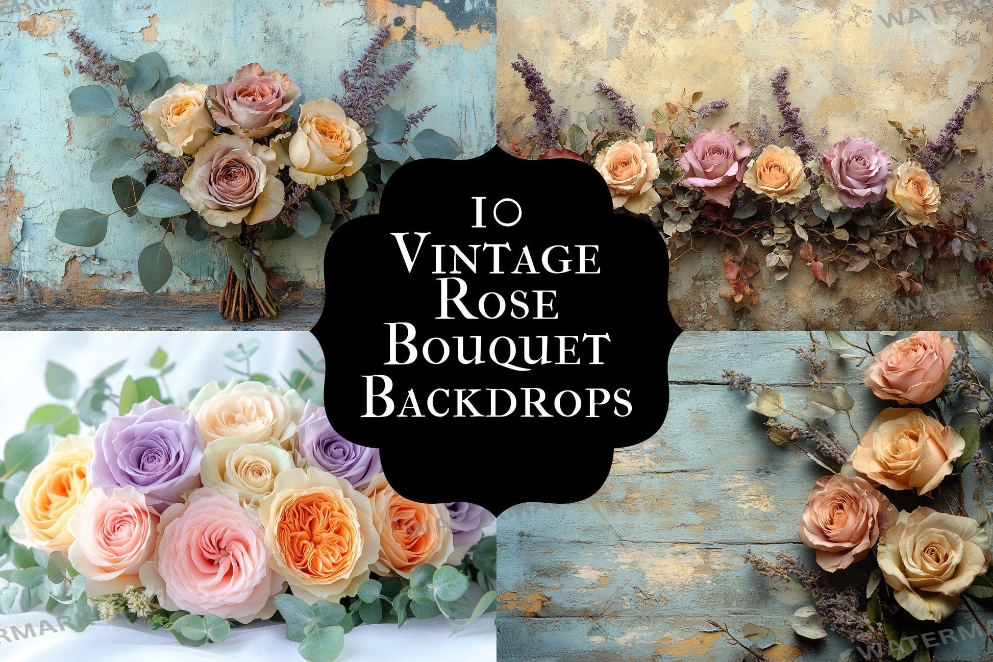 Vintage rose bouquet digital backdrops, floral PNG overlays, shabby chic photography backgrounds, pink flower scene composite props