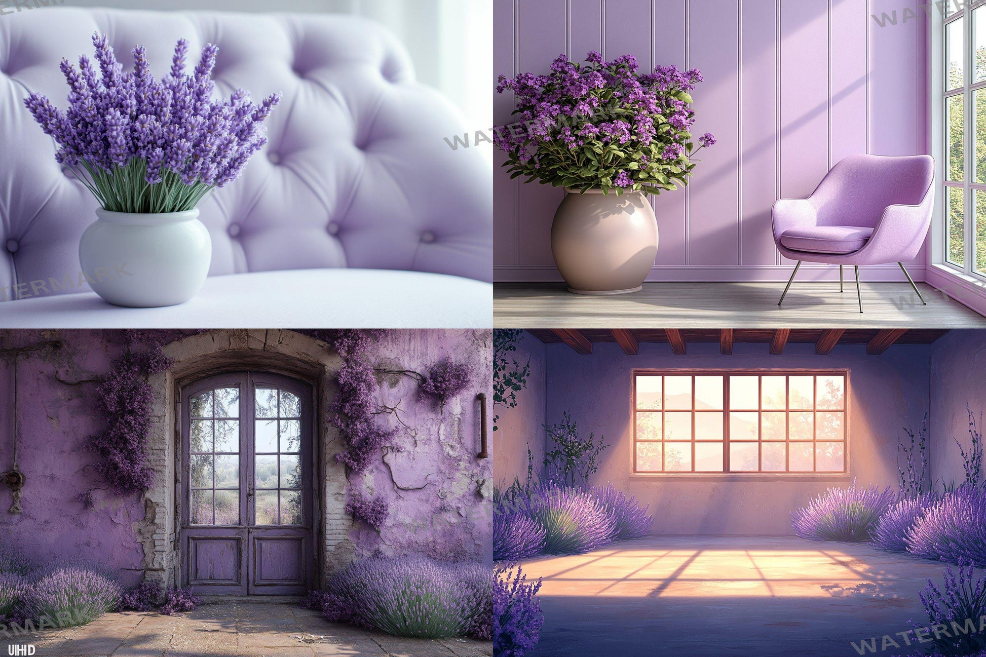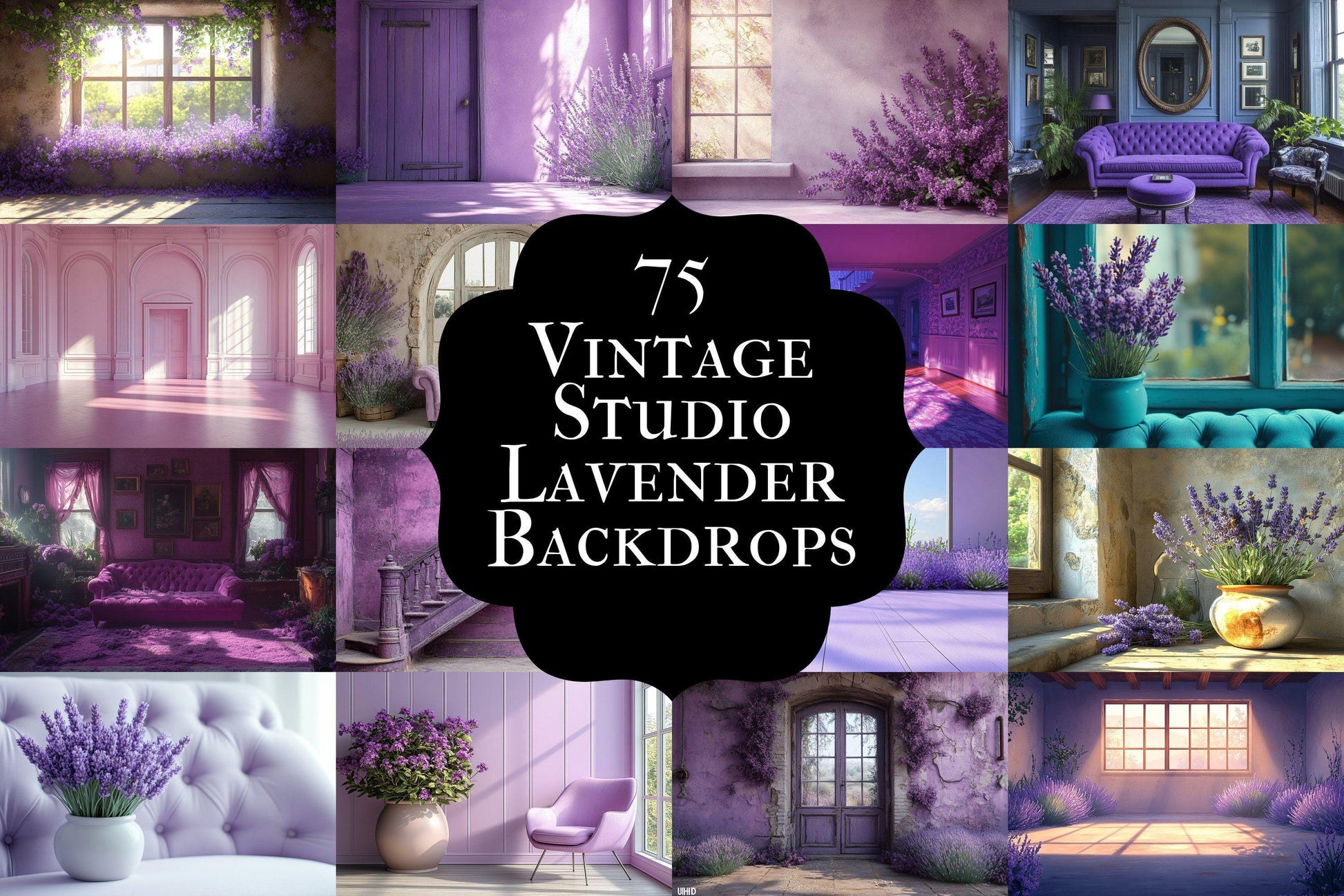 Create elegant and dreamy scenes with this collection of vintage studio digital backdrops featuring beautiful lavender and purple interiors. Perfect for portrait photography, artistic compositions, and adding a touch of floral sophistication to your work.