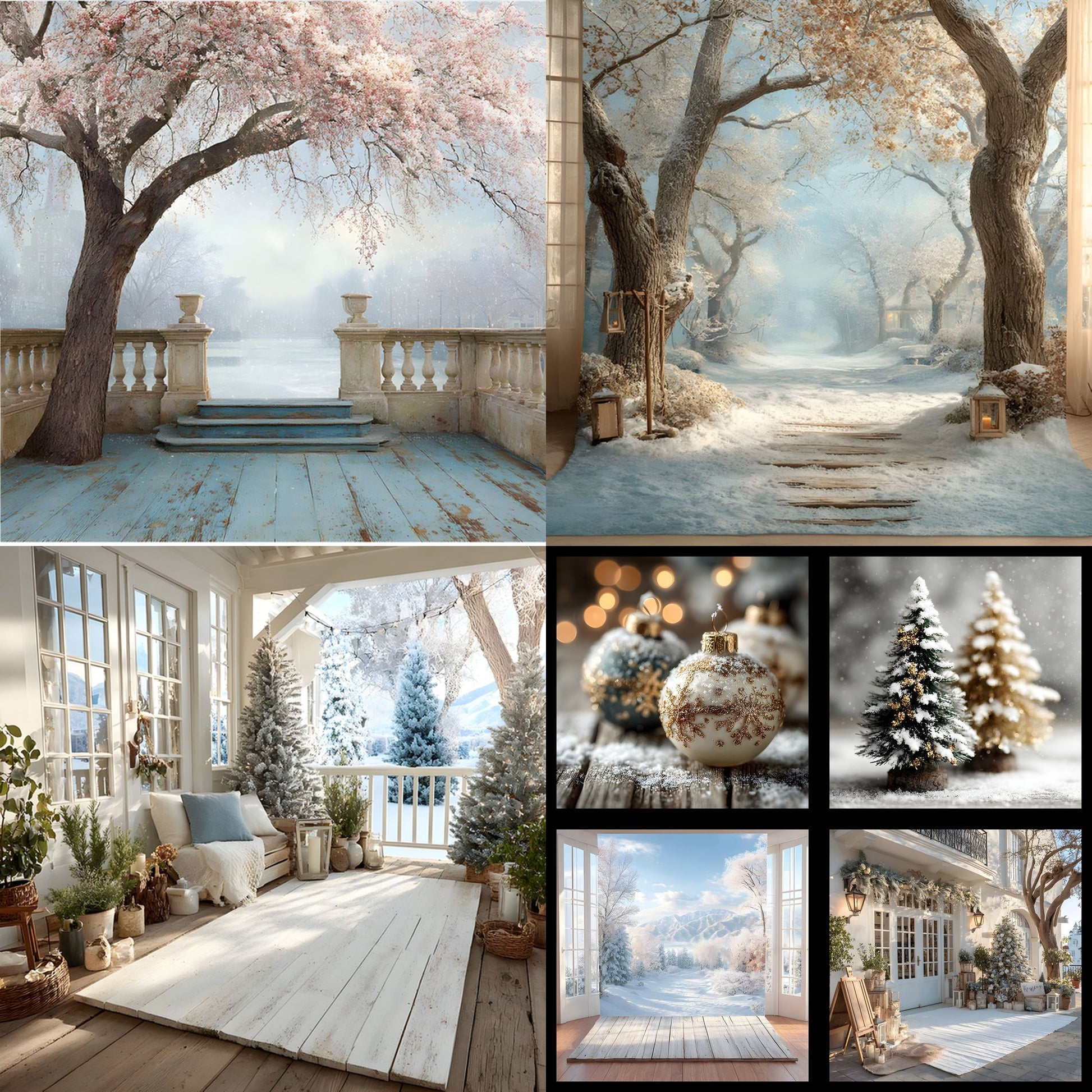 Create magical holiday portraits with our White Gold Christmas Backdrop. This square digital background features a snowy outdoor scene, perfect for festive photography. Transform your studio into a winter wonderland with this easy-to-use photo prop. The white and gold tones add a touch of elegance, ideal for Christmas cards, social media posts, and memorable family portraits. Capture the spirit of the season with this versatile and enchanting backdrop.