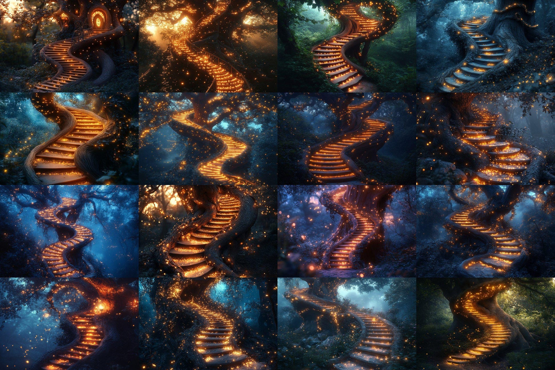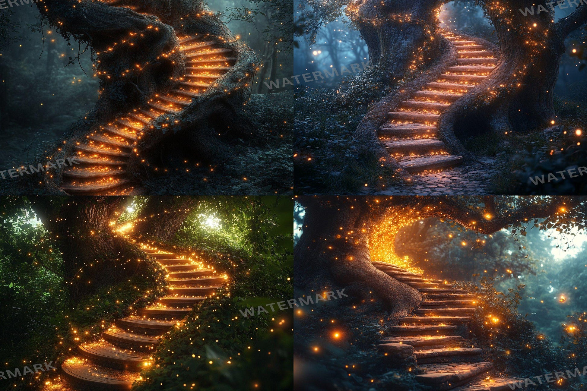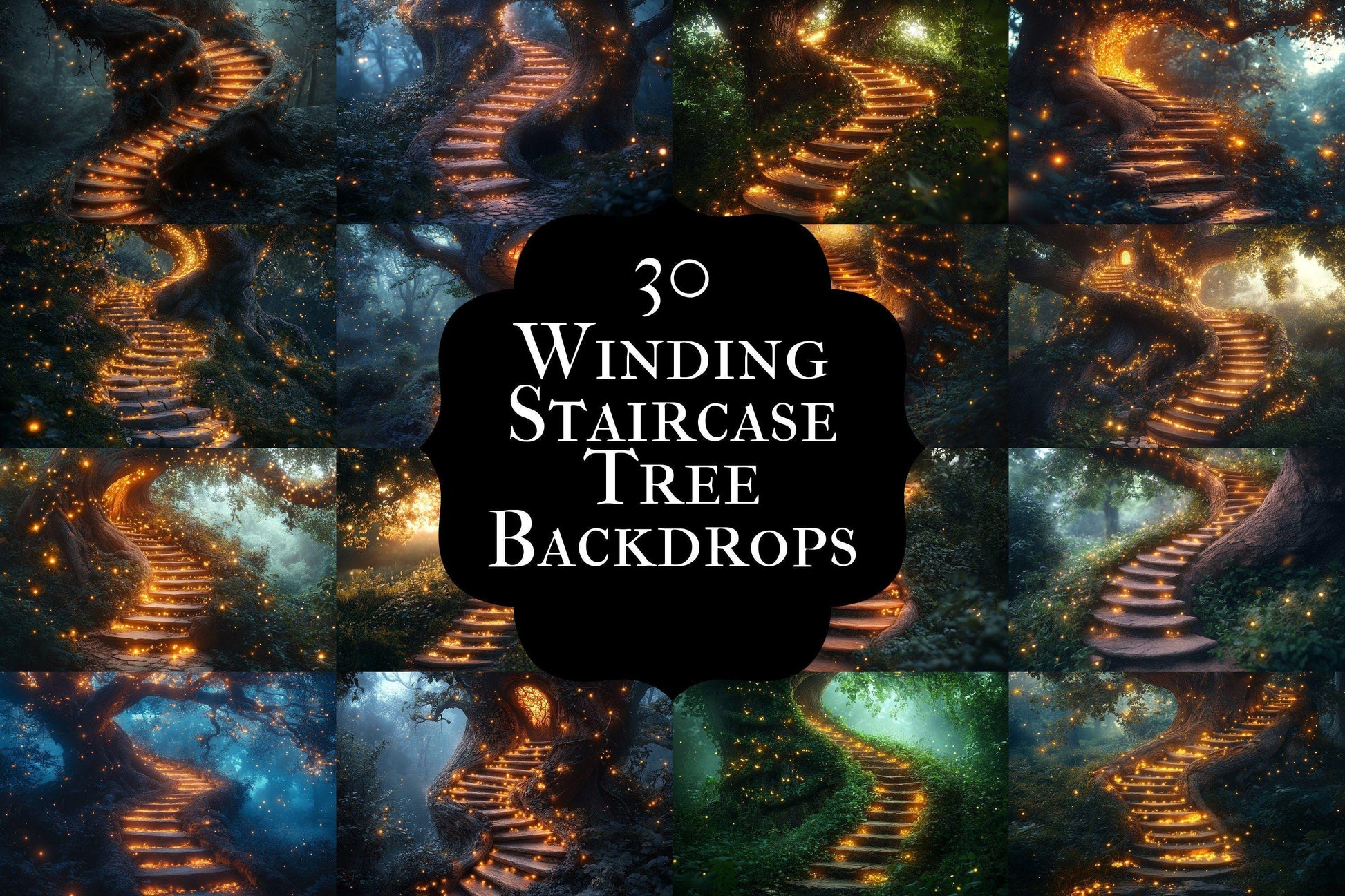 Ascend into a realm of magic with our "30 Winding Staircase Tree Backdrops"! This enchanting digital collection offers a variety of high-resolution backgrounds featuring mystical trees with winding staircases illuminated by glowing, ethereal lights. Each backdrop is designed to evoke a sense of wonder, mystery, and adventure within a vibrant, enchanted forest setting.